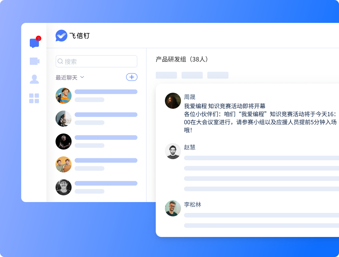 飞信钉专网部署,支持信创国产化,满足国产计算平台办公需求,且扩展性高,单位可将内部系统集成到一个平台, 打造内部一体化信息平台,提升工作效率,降低多系统办公环境下因系统切换导致的信息遗漏的风险。